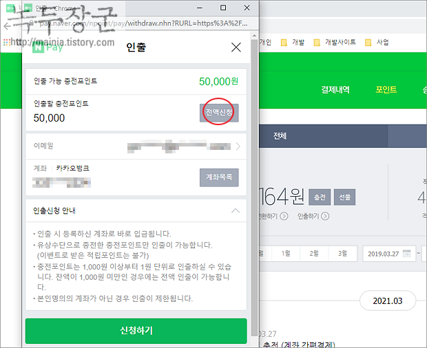 ▼ 포인트 관리 페이지에서 금액 바로 밑에 인출하기 버튼을 클릭합니다. 인출하기 팝업창에는 이전에 충전 포인트 전체 금액이 나타납니다. 현재 남아 있는 금액은 50,000 원입니다. 모두 인출을 원한다면 전액신청 버튼을 눌러 전체 금액을 추가합니다.