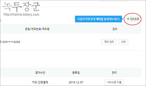 ▼ 계좌 관리로 이동해서 출금할 통장을 등록하겠습니다. 무통장으로 입금한다면 현재 과정이 필요가 없습니다. 오른쪽 상단에 계좌등록 버튼을 클릭합니다.