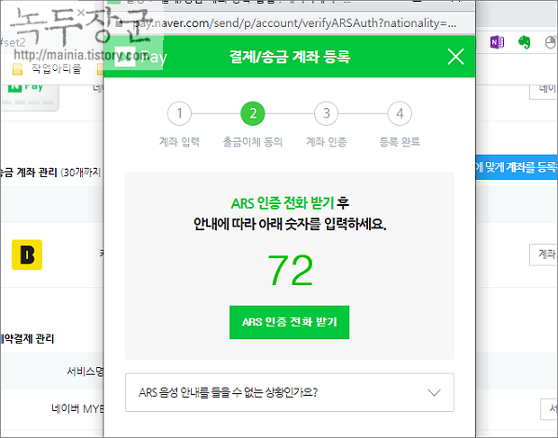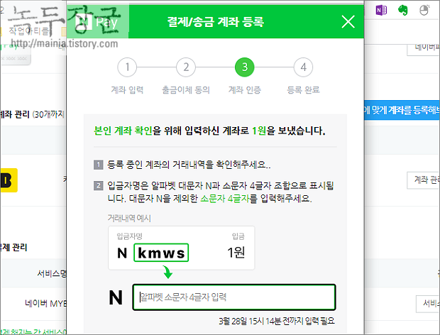 ▼ 두 번째는 네이버페이지가 보낸 1원의 입금자명에 나머지 4 글자를 화면에 입력하는 것입니다.