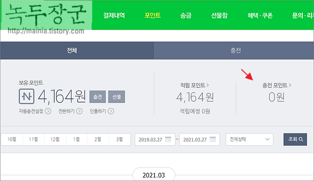 ▼ 이체할 계좌 등록이 끝났다면 관리 페이지로 이동합니다. 상단에 포인트 메뉴를 클릭합니다.