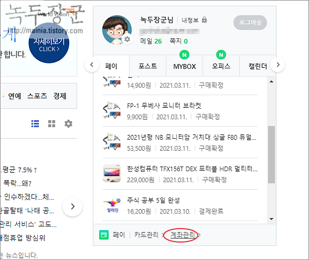 ▼ 매번 무통장 입금으로 네이버페이를 충전해 왔다면 이체할 계좌가 없을 수도 있습니다. 충전 포인트를 옮길 계좌를 등록해 보겠습니다. 먼저 로그인해서 네이버페이 관리자 화면으로 이동해야 합니다. 빠르게 이동하는 방법은 계정 정보에서 서비스를 선택하는 것입니다. 페이 서비스 목록에 계좌 관리 링크가 있습니다.