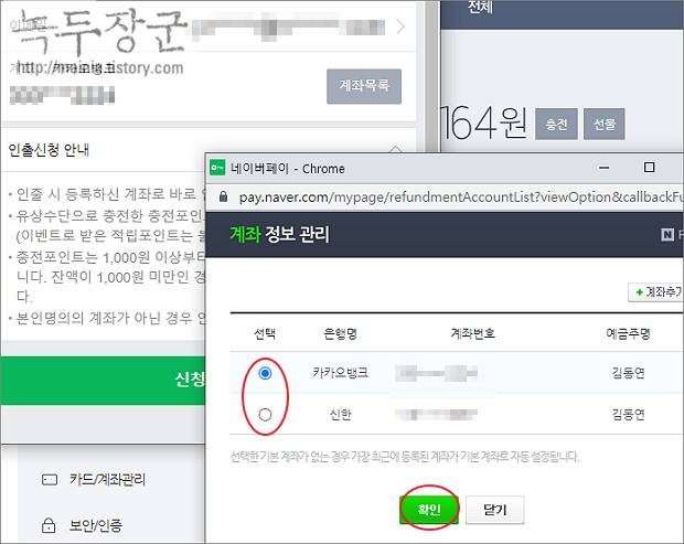 ▼ 다음은 인출할 계좌를 선택합니다. 선택 목록에는 이전에 추가한 계좌도 나타납니다. 화면 아래에 신청하기 버튼을 눌러 계좌로 입력한 금액을 전송합니다.