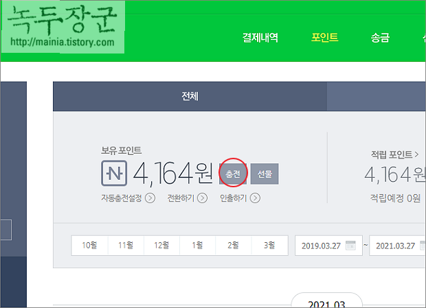▼ 포인트 관리 페이지에서 상단의 보유 포인트 옆에 충전 버튼을 클릭합니다.