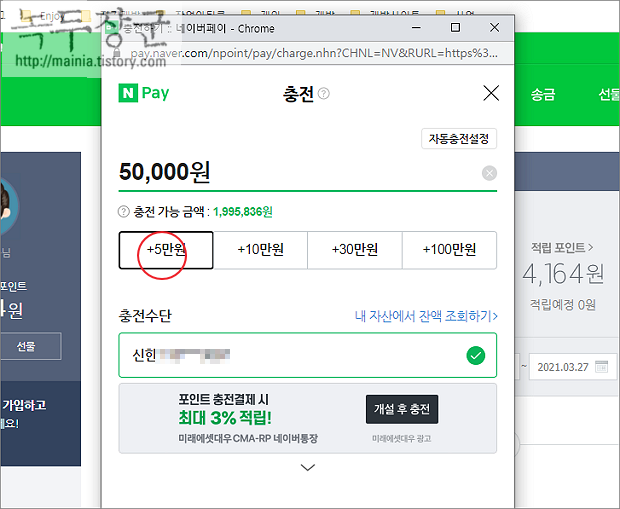 ▼ 충전 팝업창에서 은행과 금액을 입력하고 아래로 내려가서 충전하기 버튼을 클릭합니다. 네이버페이 충전은 최소 5만원 이상해야 합니다.