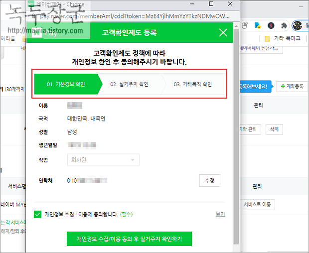 ▼ 화면에 나타난 팝업창을 통해 3단계를 거쳐서 계좌를 등록합니다. 첫 번째 단계는 본인 확인과 개인정보 수집 동의 여부를 체크하는 것입니다.