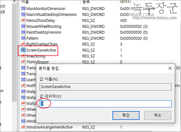 ▼ Desktop 폴더에서 ScreenSaveActive 변수를 찾아 더블 클릭합니다. 값 편집창이 뜨면 1 을 입력합니다.