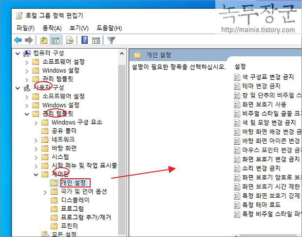 ▼ 로컬 그룹 정책 편집기 창이 뜨면 사용자 구성> 관리 템플릿 > 제어판 > 개인 설정 의 순서대로 찾아서 들어갑니다.