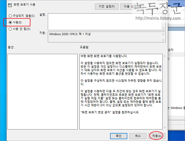 ▼ 더블 클릭해서 화면 보호기 사용 설정 창을 띄웁니다. "사용 안 함" 이나 "구성되지 않음" 을 "사용" 으로 변경합니다. 설정을 변경하고 오른쪽 하단에 적용 버튼을 누릅니다.