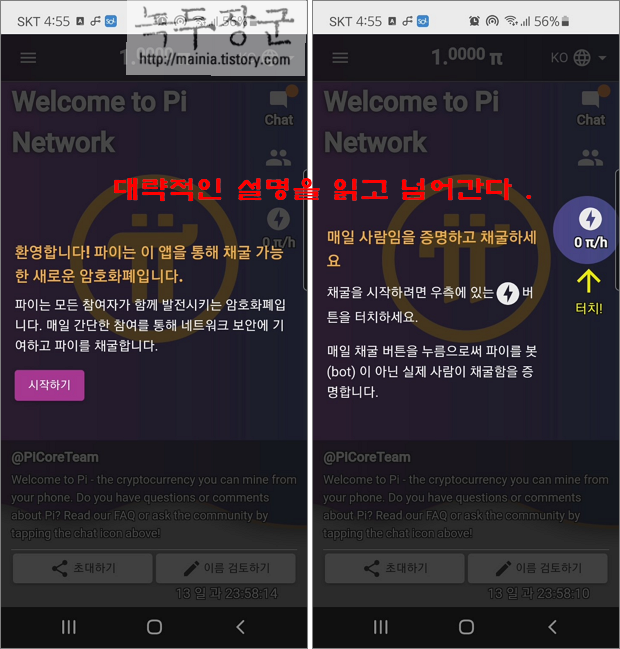 ▼ 로그인이 끝나면 화면에 대략적인 앱의 설명이 나타납니다. 가장 중요한 것이 채굴하기 버튼입니다. 사용자가 앱을 열지 않더라도 자동으로 채굴할 수 있도록 우측에 전기 스파크 모양의 버튼을 클릭합니다.