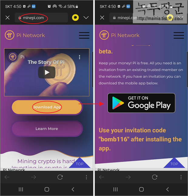 ▼ 먼저 브라우저를 띄워서 minepi.com 사이트로 접속합니다. 메인 페이지에서 Download App 버튼을 클릭합니다. 다음 페이지에서 아이폰과 안드로이드 여부를 판단해서 플레이스토어를 안내합니다.