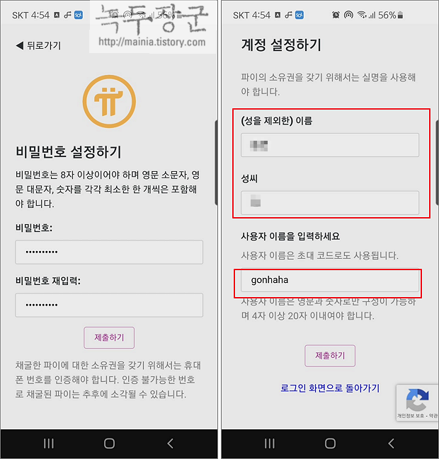 ▼ 다음은 비밀번호와 계정 이름, 닉네임을 정해야 합니다. 계정의 성과 이름은 여권에 있는 영문으로 하는 것이 좋습니다. 나중에 코인을 받을 때 인증 자료로 쓰기 때문입니다. 사용자 이름은 자기가 원하는 이름으로 합니다. 다른 사람에게 추천인 아이디로 씁니다.