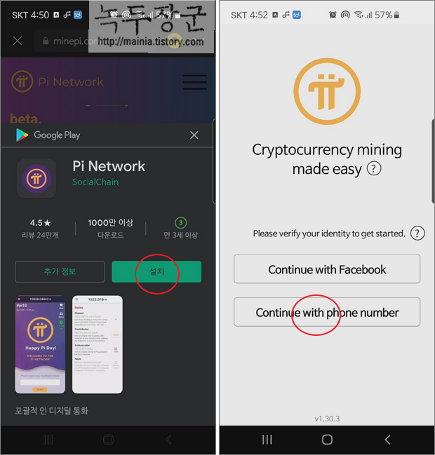 ▼ 안드로이드 폰일 경우 플레이스토어에서 Pi Network 앱을 찾아 보여줍니다. 설치 후 첫 화면에서 어떤 방식으로 계정을 추가할 것인지 선택합니다. 저는 페이스북을 잘 사용하지 않아서 휴대폰 번호로 계정을 만들기로 했습니다. Continue with phone number 버튼을 클릭합니다.