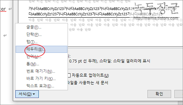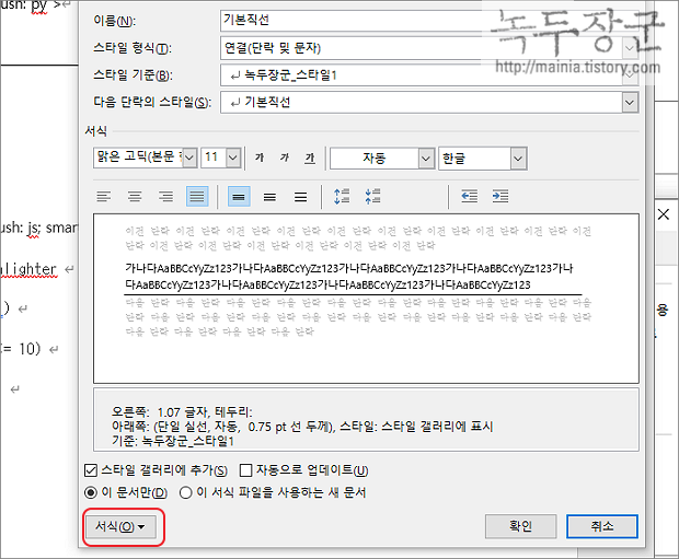 ▼ 스타일 수정 화면에서 아래로 내려갑니다. 그리고 서식 버튼을 클릭합니다.