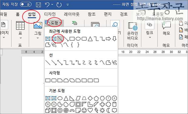 ▼ 첫 번째는 사용자가 선 도형을 추가해서 그리는 방법입니다. 선 도형은 삽입 탭 > 도형 에 있습니다.