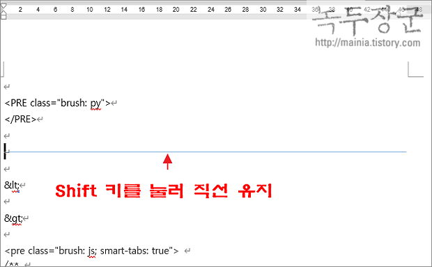 ▼ 두 번째는 단축키를 이용해서 선을 추가하는 방법입니다. 빠르게 삽입이 가능하지만 사용자가 선택할 수 있는 선의 종류가 제한적입니다. 화면에 직선 추가를 위해 하이픈 --- 3개를 입력하고 Enter 를 눌러보세요. 그림처럼 하단에 선이 추가되었습니다.
