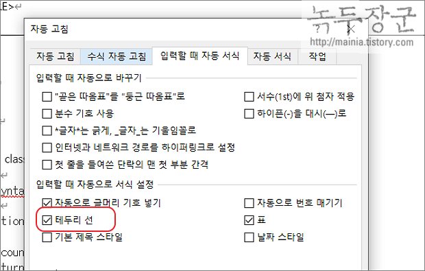 ▼ 자동 고침 > 입력할 때 자동 서식 탭에서 테두리 선이 체크되어 있는지 확인합니다.