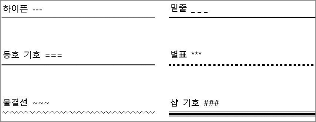 ▼ 선의 종류는 다음과 같습니다. 모두 해당 특수기호 3개를 입력하고 Enter 를 눌러 선을 삽입합니다.
