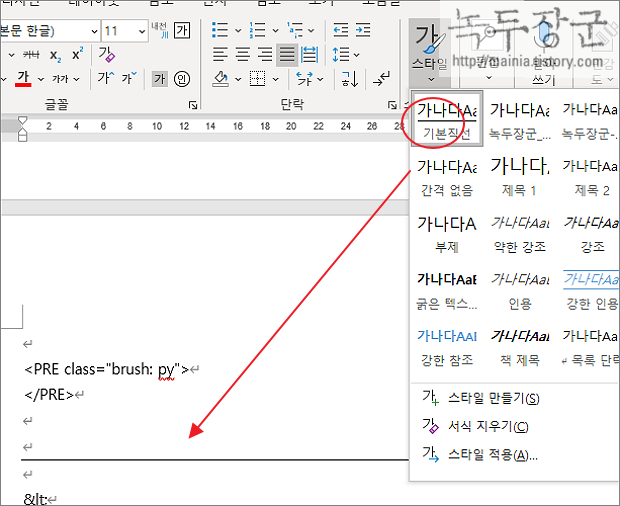 ▼ 지금까지 작업한 내용은 스타일 목록에서 확인이 가능합니다. 구분 선 삽입 위치에 커서를 두고 만든 스타일을 클릭합니다.