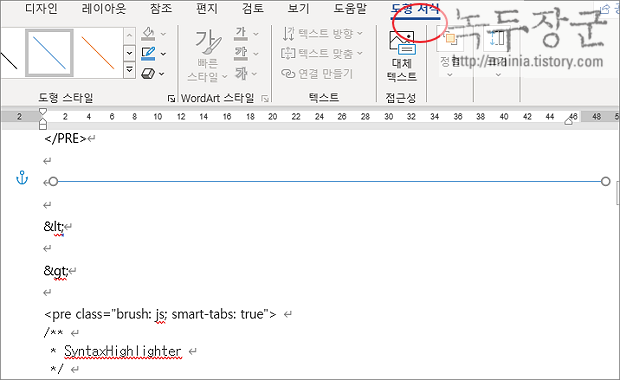 ▼ 최초 삽입한 선의 굵기와 색상은 기본값은 파란색에 1pt 입니다. 선을 선택하고 화면 상단에 도형 서식 탭으로 이동해서 색상이나 두께 같은 스타일을 조절합니다.
