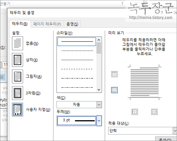 ▼ 테두리 및 음영 대화상자에서 사용자가 원하는 스타일을 적용하고 창을 닫습니다.