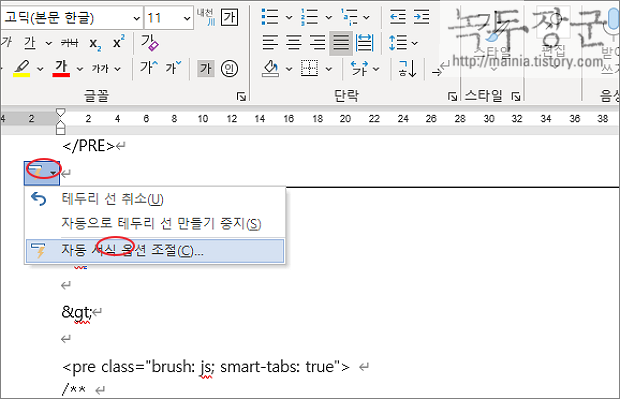 ▼ 이것이 가능한 이유는 자동 서식 옵션에서 테두리 선 삽입을 체크했기 때문입니다. 만약 화면에 선이 나타나지 않는다면 옵션을 살펴봐야 합니다. 선 삽입 후 왼쪽 상단에 나타난 자동 서식 메뉴를 클릭합니다. 하위에 자동 서식 옵션 조절 메뉴를 선택해서 옵션 화면으로 이동합니다.