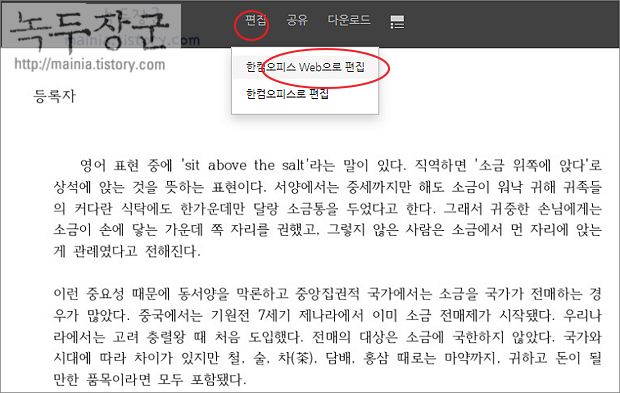 ▼ 추가한 파일을 클릭해서 미리 보기 화면을 띄웁니다. 상단 메뉴에서 편집 > 한컴오피스 Web으로 편집 을 선택합니다.