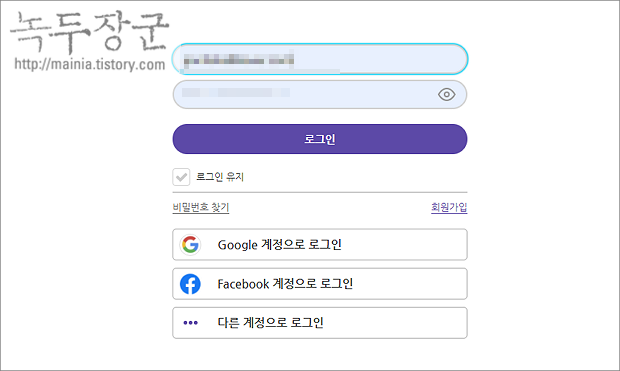 ▼ 로그인 계정을 만드는 방식은 여러가지입니다. 페이스북이나 구글 계정을 이용하거나 신규로 가입합니다.