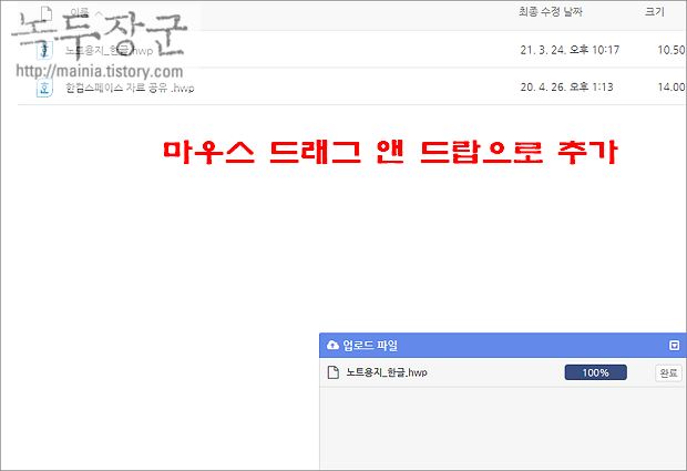 ▼ 그림처럼 업로드 버튼이 아닌 화면에 드래그 해서 파일을 추가할 수도 있습니다.