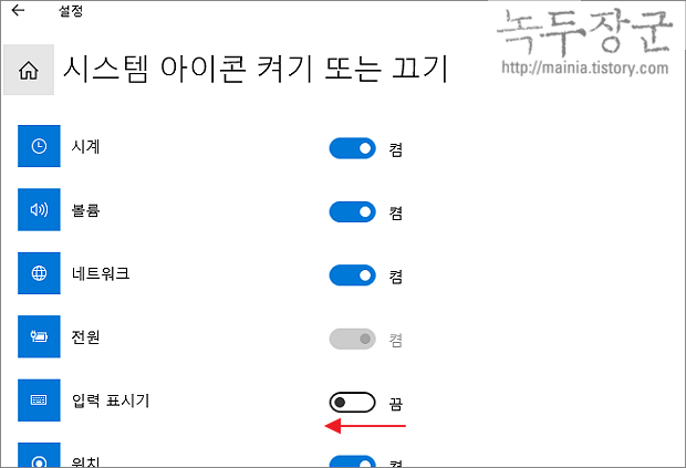 ▼ 시스템 아이콘과 관련된 상세 설정 화면에서 입력 표시기를 찾습니다. 옵션을 켬에서 끔으로 변경합니다.