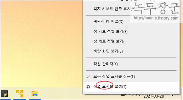 ▼ 이것을 작업표시줄에 나타나지 않도록 설정을 변경해 보겠습니다. 작업 표시줄에서 오른쪽 마우스를 눌러 작업 표시줄 설정 메뉴를 선택합니다.