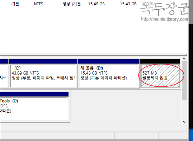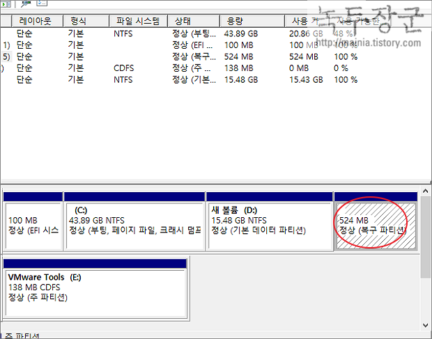 ▼ 그림처럼 디스크 끝에 복구 파티션이 보입니다. 이것을 삭제하도록 하겠습니다. 대략 530MB 정도 됩니다.