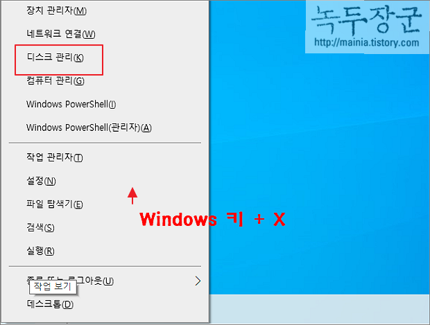 ▼ 파티션 분할 삭제를 하기 위해서는 디스크 관리 설정 화면으로 가야 합니다. 윈도우키 + X 버튼을 눌러 메뉴 목록을 띄웁니다. 왼쪽 하단에 뜨는 메뉴 목록에서 디스크 관리 를 클릭합니다.