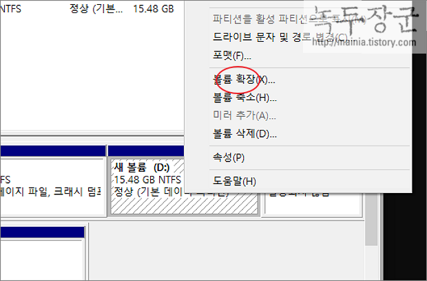 ▼ 삭제한 복구 파티션을 다른 파티션과 합치겠습니다. 바로 옆에 붙은 드라이브와 합칠 수 있습니다. 오른쪽 마우스를 눌러 볼륨 확장 메뉴를 선택합니다.