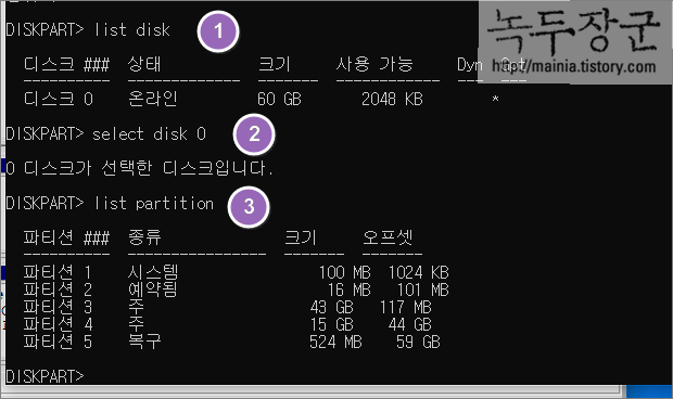 세 번째는 현재 선택한 디스크에 어떤 파티션이 있는지 조회합니다. 복구 파티션의 번호를 알기 위해서 입니다.
