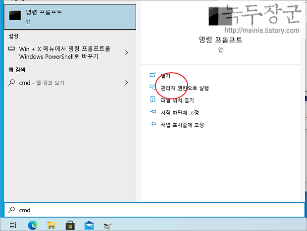 ▼ 명령프롬프트에서 diskpart 유틸리티로 삭제를 진행할 예정입니다. 검색창에서 명령프롬프트를 찾아 관리자 권한으로 실행합니다.