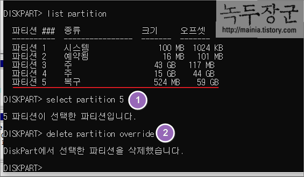 ▼ list partiton 명령어로 조회한 목록에서 복구 파티션이 5번 입니다. 삭제를 위해 복구 파티션의 번호를 입력해서 선택합니다.