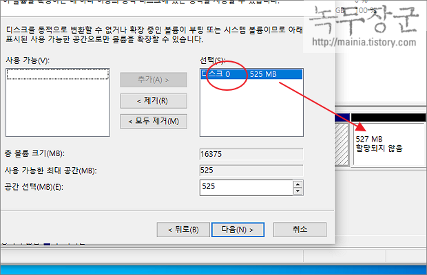 ▼ 선택한 디스크가 이전에 삭제한 복구 파티션인지 확인합니다. 공간 선택에 전체 영역인지 수치를 확인하고 다음 버튼을 눌러 진행합니다.