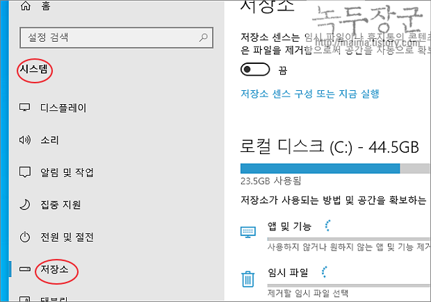 ▼ 다음은 콘텐츠의 종류별로 저장하는 위치를 변경하는 방법입니다. 프로그램을 설치하는 Programs File 이나 문서, 이미지 등에 저장되는 모든 위치를 변경할 수 있습니다. 예를 들어 exe 파일을 클릭해서 프로그램을 설치하면 C 드라이브의 Programs File 폴더로 들어갑니다. 이 위치를 바꿀 수 있다는 것입니다. 설정에서 시스템 > 저장소 메뉴를 선택합니다.