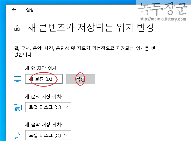 ▼ 새 콘텐츠가 저장되는 위치 변경 화면에는 위치 변경이 가능한 여러 항목들이 있습니다. "새 앱 저장 위치" 가 Programs File 에 저장되는 앱 설치 위치를 말합니다. 위치를 변경하고 적용 버튼을 누릅니다. 기존에 저장되어 있던 모든 파일들은 변경한 곳으로 이동합니다.