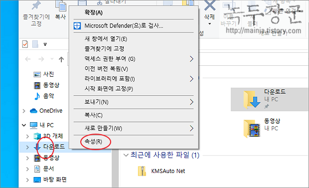 ▼ 왼쪽 사이드의 내 PC 에서도 다운로드 폴더를 찾을 수 있습니다. 오른쪽 마우스를 눌러 속성 메뉴를 선택합니다.