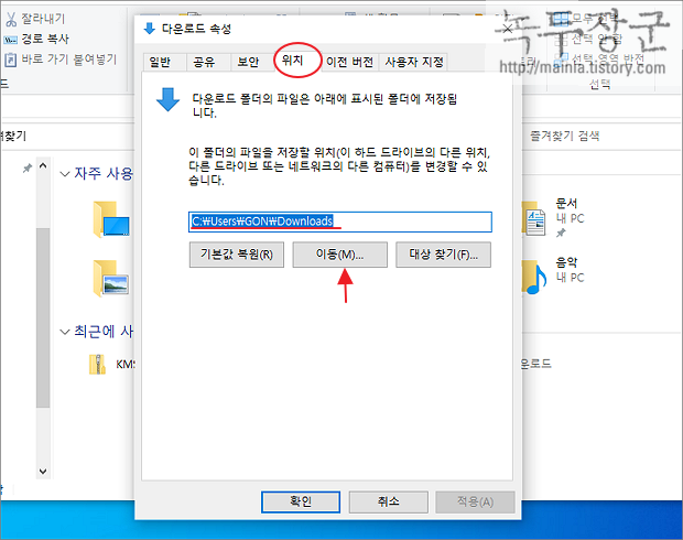 ▼ 그림처럼 다운로드 경로가 사용자가 지정한 곳으로 변경되었습니다. 마지막으로 화면 아래에 적용 버튼을 클릭합니다.