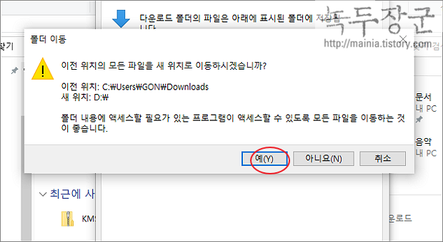 ▼ 이전에 다운로드한 파일들을 옮긴 위치로 이동할 것인지 묻습니다. 예를 누르면 전부 이동합니다.