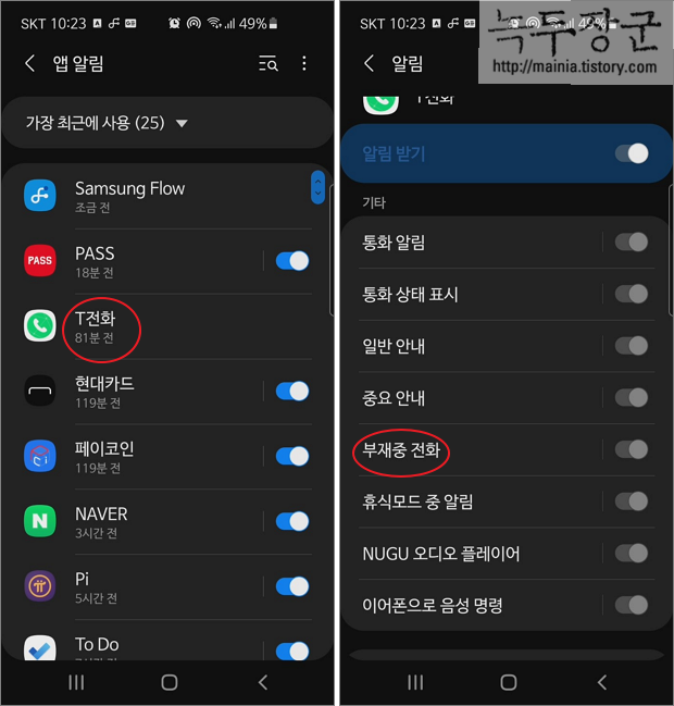 ▼ T 전화 앱을 눌러 상세 알림 옵션 화면으로 이동합니다. 우선 상단에 알림 받기가 활성화되어 있는지 확인합니다. 다음 목록에서 부재중 전화를 클릭합니다.