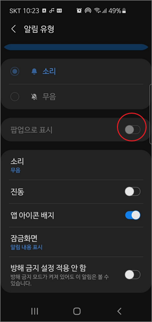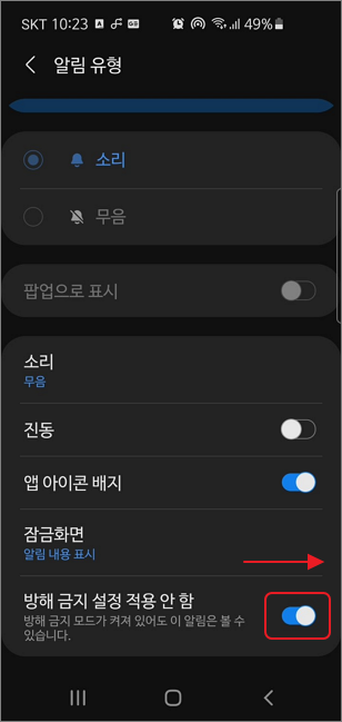 ▼ 마지막으로 방해금지 시간대에 알림을 표시할 것인지 결정하는 옵션입니다.