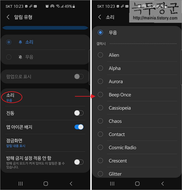 ▼ 다음은 무음인 소리를 변경합니다. 소리 메뉴를 클릭해서 목록에 알림음 중 하나를 선택합니다.
