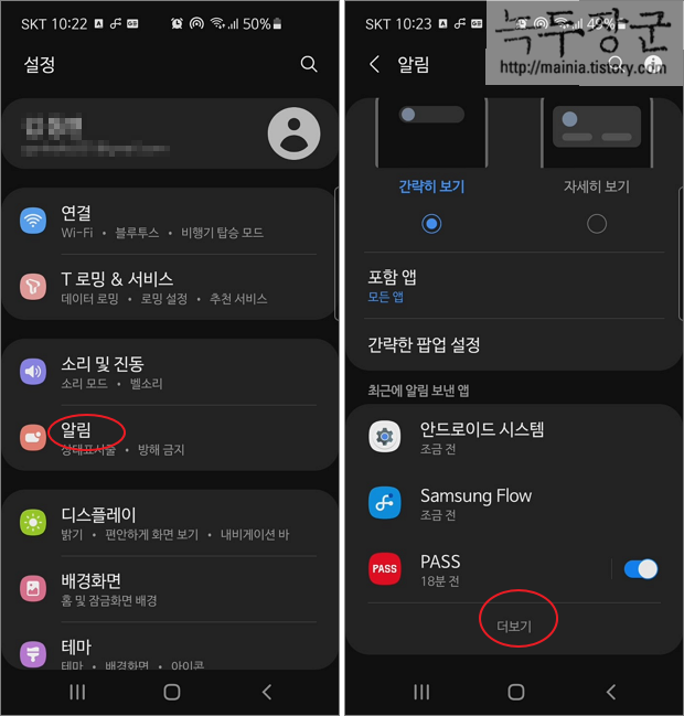 ▼ 부재중 통화 표시와 관련한 옵션은 설정 > 알림에서 변경할 수 있습니다. 알림 화면에서 최근에 알림 보낸 앱 항목에 더보기를 눌러 T 전화 앱을 찾습니다.