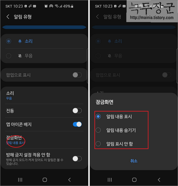 ▼ 알림 유형에서 아래로 더 내려가면 잠금 화면 옵션이 있습니다. 잠긴 스마트폰 화면에 알림을 표시할 것인지 결정하는 옵션입니다. 스마트폰의 잠금을 풀어서 메시지를 보지 않아도 되기 때문에 알림 내용을 표시하는 것이 좋습니다.