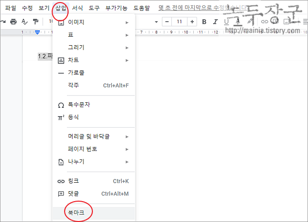 ▼ 북마크도 제목 스타일과 동일한 방식으로 연결할 수 있습니다. 북마크 영역을 선택하고 삽입 > 북마크 메뉴를 선택합니다.