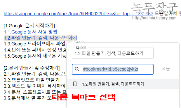 ▼ 북마크 연결 정보에서 다른 북마크를 선택하고 적용합니다.