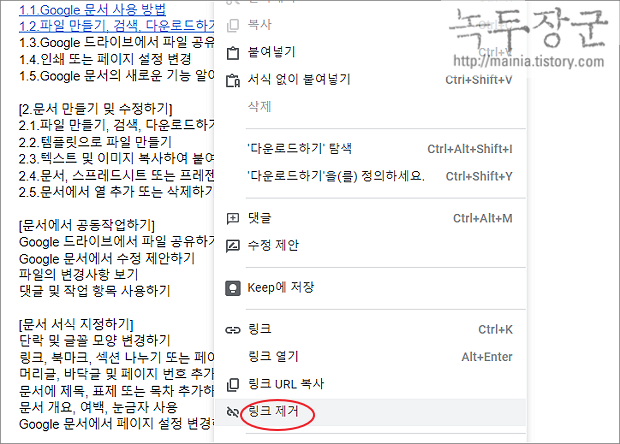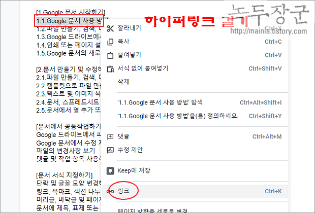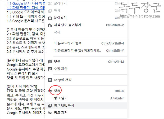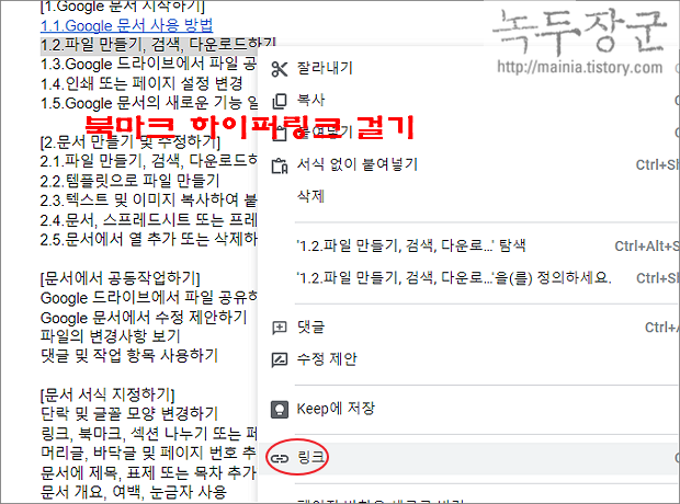▼ 제목 스타일을 적용한 위치와 연결을 텍스트를 선택한 후 오른쪽 마우스를 클릭합니다. 메뉴 목록에서 링크를 선택합니다. 단축키는 Ctrl + K 입니다.
